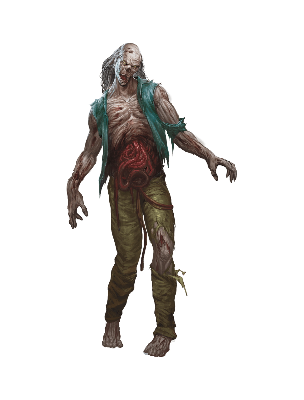 Zombies were reanimated Undead corpses driven by an insatiable hunger for the living. They moved with slow, plodding steps, though some retained fragments of their former strength, allowing brief bursts of surprising speed. Their flesh was often decayed or torn, and a sickly stench clung to them, marking the passage of time since their death. These creatures were mindless, responding only to instinct and the presence of life.