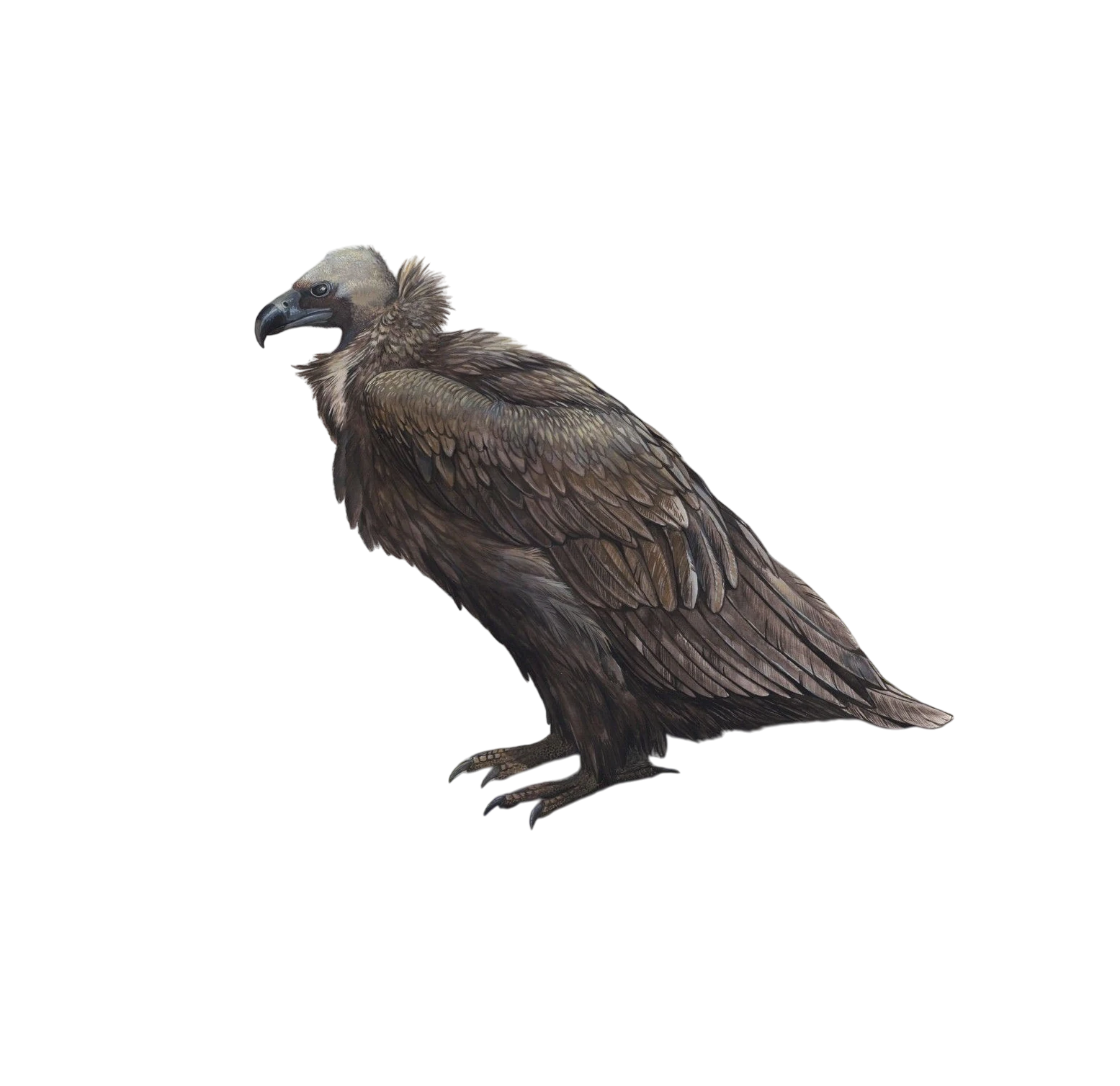 Vultures were large scavenging birds with broad wingspans, bald heads, and hooked beaks designed for tearing flesh. Their feathers were usually dark, with shades of brown, black, or gray, and their bare heads and necks helped them stay clean while feeding on decaying carcasses.
