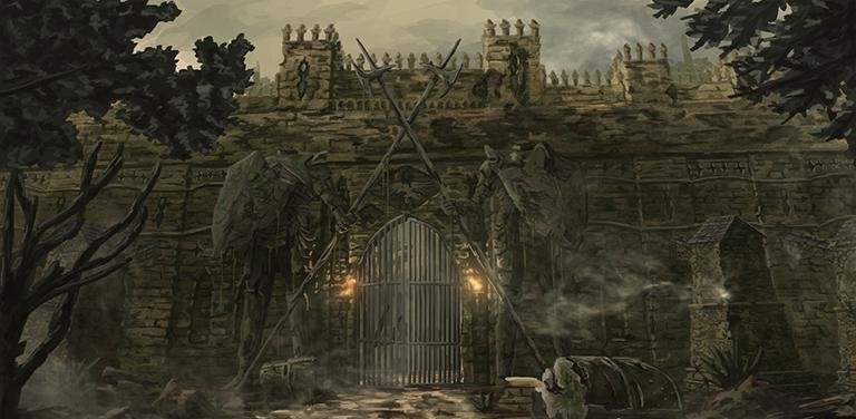 Jutting from the Svalich Woods on both sides of the Old Svalich Road, the Gates of Barovia were composed of high stone buttresses and huge iron gates. Rust and wear were evident on these walls, uncared for since the beginning of the reign of Strahd von Zarovich. Two enormous statues of armed guardians flanked the gates, spears in hands, with their heads lying among the weeds at their feet.