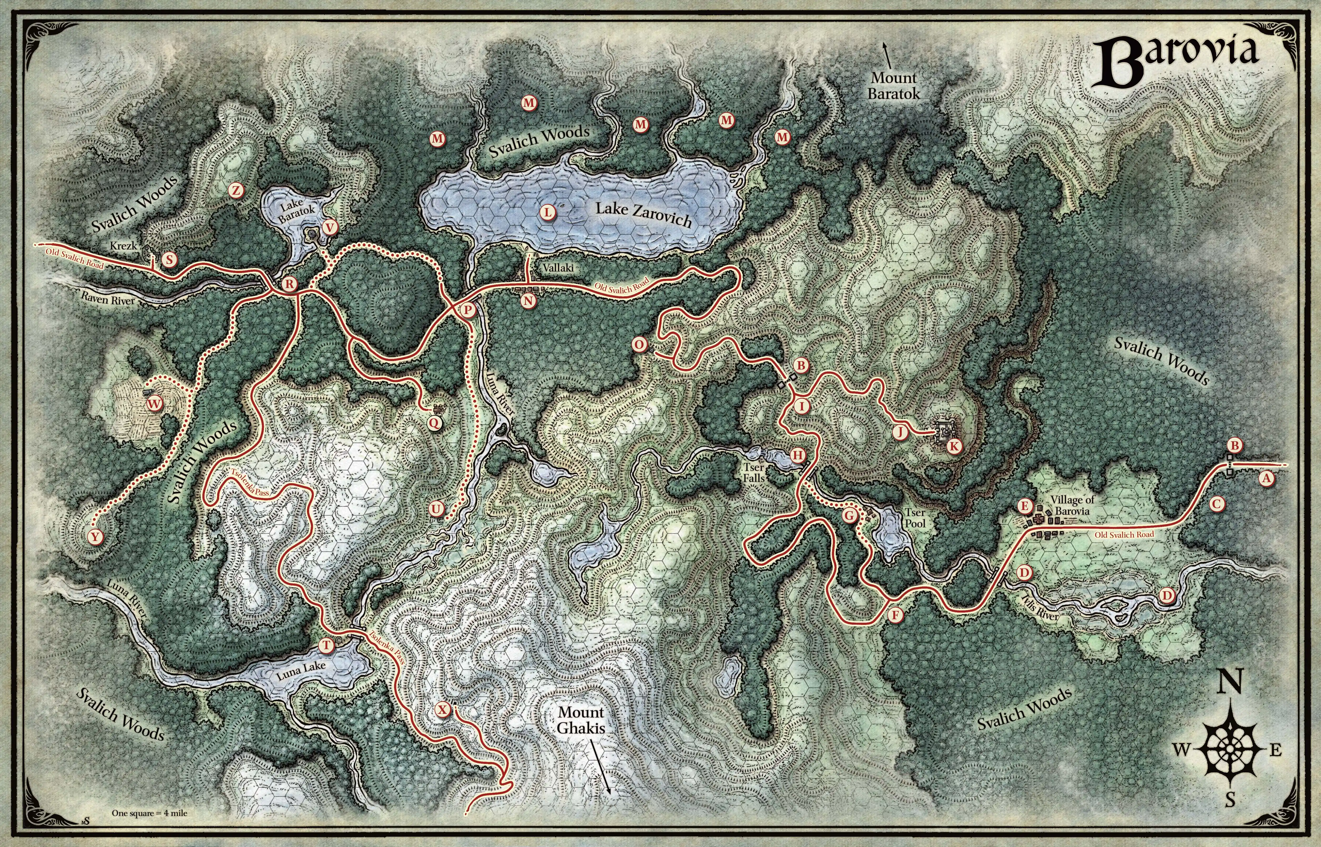 When Barovia was at its largest size under Strahd's reign, normal travel pace (8 hours a day on normal terrain, no penalties) was 24 miles, or 6 hexes/day. Travel with draft horses and wagons was 36 miles, or 9 hexes/day, though this pace was only possible on the Old Svalich Road and up Tsolenka Pass. Travel on riding horses was 48 miles, or 12 hexes/day.
