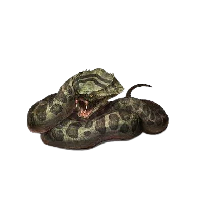 Snakes, also called "serpents", were legless, reptilian Beasts found across nearly every habitat on land and in water. Their bodies were covered in overlapping scales, providing protection and aiding movement. Sizes varied greatly, from a few inches to over 20 feet, and some species could weigh several hundred pounds. They consumed prey whole, relying on flexible jaws and strong digestive systems to process animals larger than their heads.