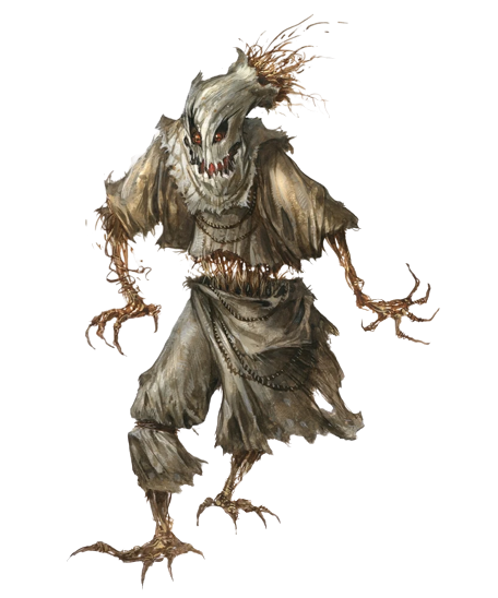 Scarecrows were terrifying killer constructs animated by the spirit of a slain evil creature. Typical scarecrows were constructed from a stuffed sackcloth roughly shaped like a humanoid, though some were augmented to be made of scythes, knives, or other dangerous materials. All were dangerous combatants, but those crafter by a powerful spellcaster were imbued with the ability to magically instill fear into opponents with their terrifying visage.