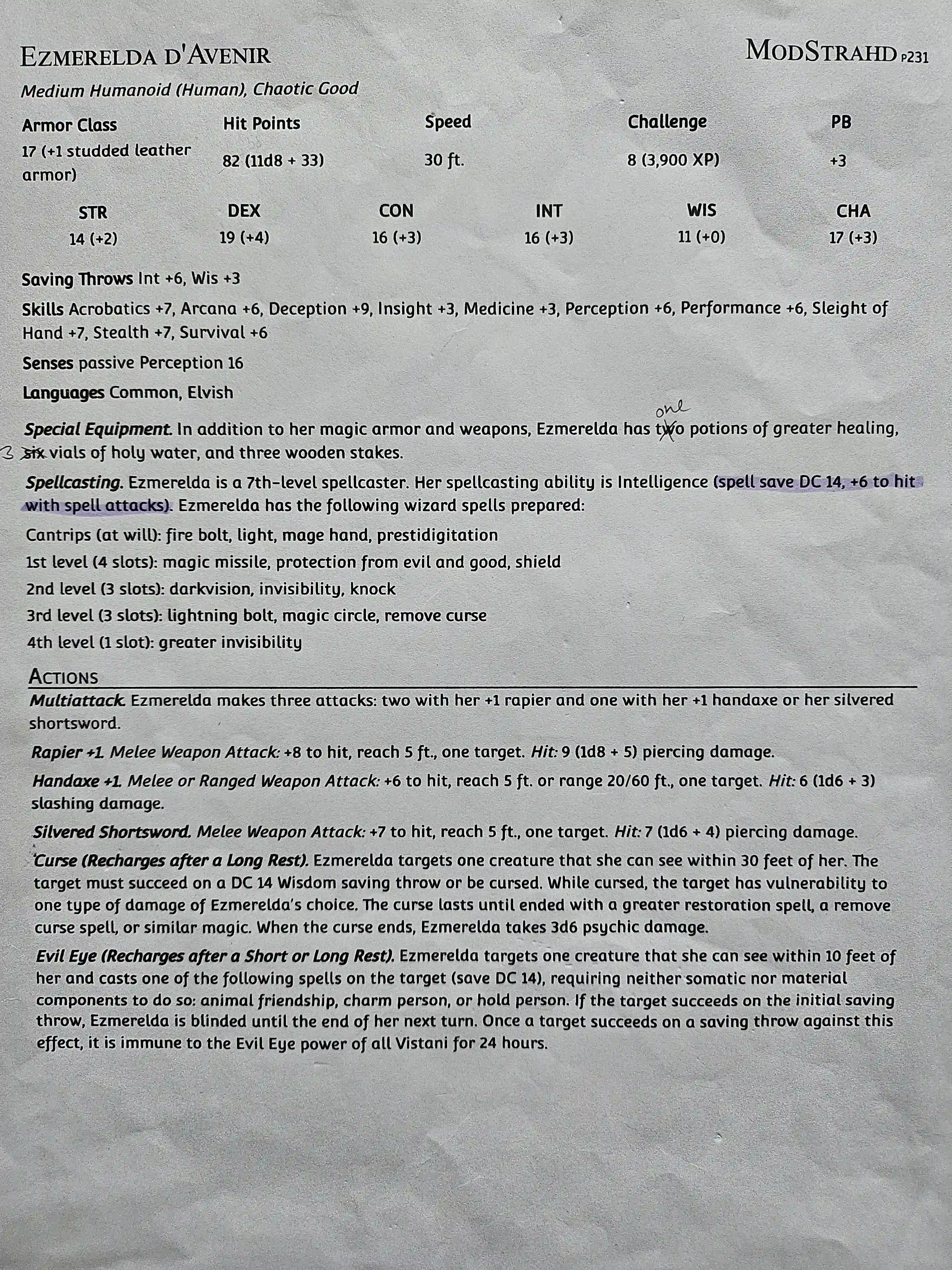 Following a self-styled tarokka reading, she headed to the Abbey of Saint Markovia to learn more about Barovia from The Abbot. Ezmerelda made her way through the fortification of Krezk and the Abbey's Mongrelfolk guards by using invisibility magic, and confronted The Abbot in his chapel. She found him to be welcoming and friendly, but obviously insane; she learned details of Strahd and the Barovian Calender Timeline, as well as his musings on Saint Alizandra Markovia. Disheartened, she planned to leave the next day.