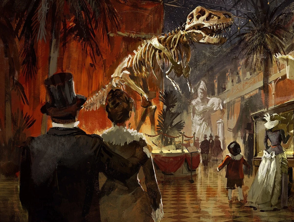 Outside, Leila and Matthew were supposed to scope any weaknesses in the building, but Matthew got caught up in preaching to the door guard Grendor Battleaxe about the merits of Torm. Leila scoped the sides of the windowless building and asked Matthew to check the top, but learned that her aarakocra companion had never learned how to fly. Why was he even a bird? Obtaining no useful information, they hung their heads and decided to go inside the museum. They met with Rasmus and Ellenor upstairs at the main exhibit, where an animated Allosaurus Skeleton was displayed. The guard captain, Mariam Bikram, watched the party as she guarded the Gemstone Wing, which was being prepped for the gala.