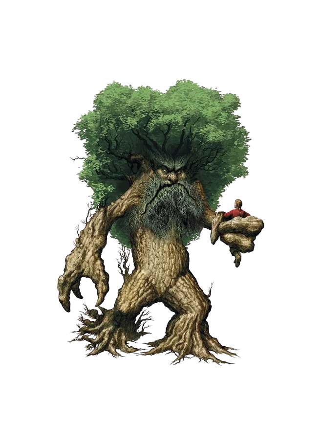Treants were awakened trees that dwelled in ancient forests, whiling away years in quiet contemplation. They were typically guardians of their forest, possessing immense strength, wisdom, and deep connection to the natural world. While generally indistinguishable from a regular tree, they occasionally moved slowly but purposefully if needed. Through their root network, they could call wild creatures to aid them or carry messages across great distances.