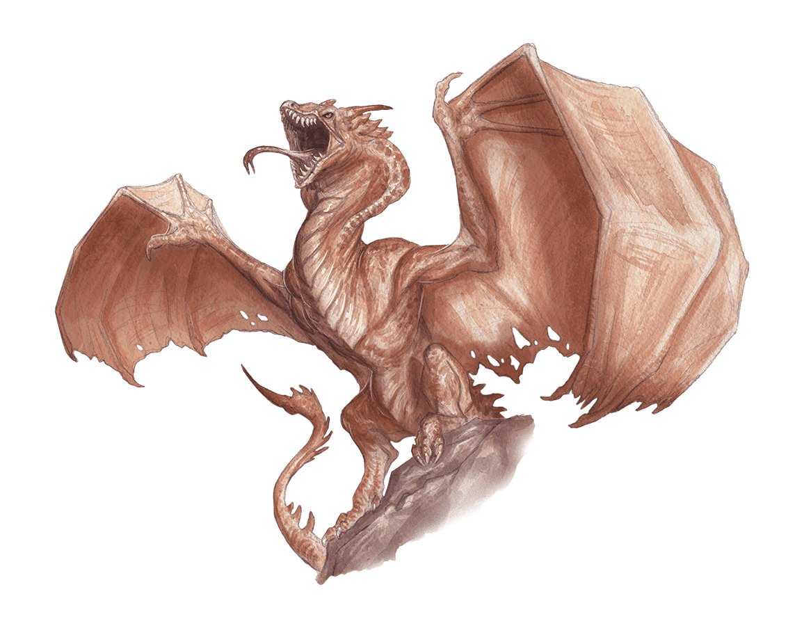 Large winged lizards with poisonous scorpion-like tails and sharp teeth, wyverns were distantly related to mighty Dragons. They hunted the same tangled forests and caverns of their kin, and with leathery wings that gave them a wingspan of up to twenty feet, were extremely proficient flyers. They were covered in hard scales, ranging from dark brown to grey in colour, and generally communicated via hisses and throated growls. Lacking forelegs, they were relatively slow on land, and used their large stinging tail to maintain balance when on foot. In the sky, however, wyverns were extremely dangerous, wielding their stinger and claws with great ferocity.