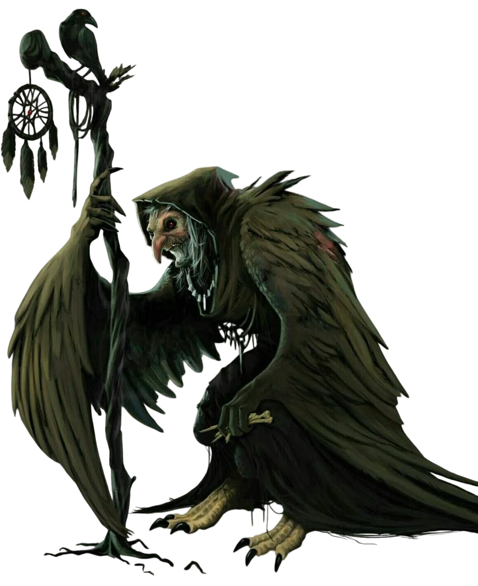 Using powers that he learned from the Amber Temple, The Abbot eventually turned Iaseka into the first successful Mongrelfolk. Her madness worsened, and her body was constantly in pain, but she was satisfied with her new form. She now had a hooked beak covered in human flesh, black crow's eyes, the disembodied jaw taken by a nearby skull, eagles talons for feat, and bat-like hands that stretched from long raven's wings that protruded from her back. Iaseka felt free for the last few years of her short life, and when she passed away, she was fed to her children.