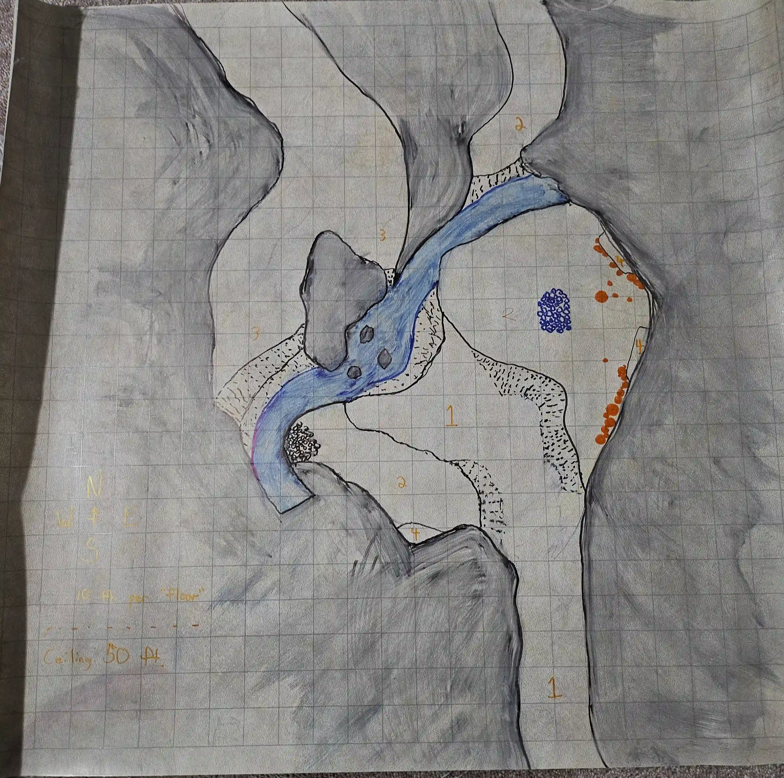 Ajuni was sure that the maps told them to descend the sharp cliff into the fog below them, but Tobias was hesitant. Mormeros tested the drop with his bag of beans, but could not ascertain how far they fell by sound alone. Eventually, Marcus convinced everyone to take a leap of faith; as they passed the cloud barrier, Ajuni used a Spell Scroll of Feather Fall to slow their descent onto the jagged cliffside. Stretching for miles below them was an incredibly large, permanently frozen, lake: the Everglass.