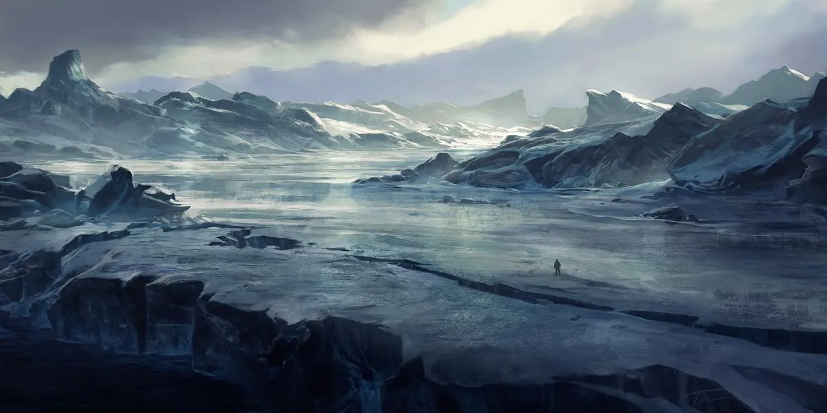 The Everglass lay high in the southeastern Crowncrests, a massive lake held in a broad stone basin beneath constant cold. It stretched for more than fifty miles from west to east; even during the Long Gleam, the air remained sharp, and the surrounding peaks kept warmer winds at bay. From a distance, the lake appeared less like water and more like a single, continuous sheet of stone. At its eastern end, the Everglass terminated at Giantsbane, where the shattered skeleton of an immense giant lay half-embedded in ice and rock.