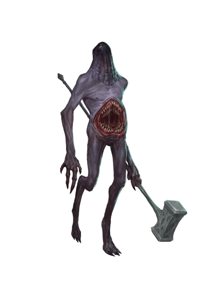 These creatures attacked any threat with iron-hard, long-fingered hands that delivered massive damage, and also hurled itself atop opponents to bite with its abdominal mouth. If it didn't want to close with opponents, it used a great, 10-foot-long hammer of arenite, a magma alloy harder than most rock. A tapper could wield this weapon one-handed and throw it with great accuracy, then re-summon it back into its hands.