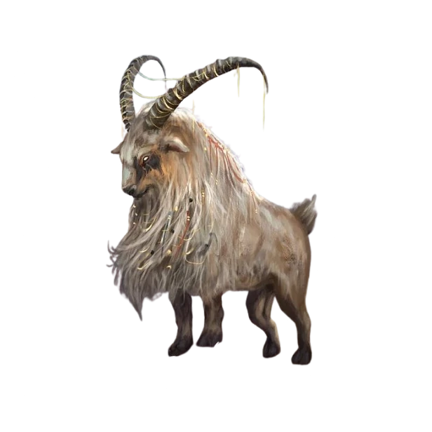Giant goats were a rare species of Goat, far larger than usual. On average a giant goat grew to be 5 ft (1.5 m) tall at the shoulder, and grew long, sharp horns that could be significantly more varied and artful than their smaller kin. They were found in hilly and mountainous regions, and were quite rare: their horns and hooves were often prized products for Mortalkind traders.
