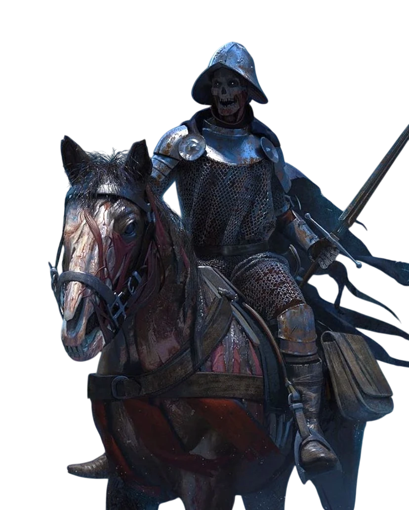 He died from his wounds as he made his way to the Black Carriage Crossroads, but the spirit of the cleric and his horse lingered. Over centuries, High Priest Ciril became a fixture on the Old Svalich Road, wandering without sentience or purpose but never deviating from his path. Reduced to a near-mindless Skeleton in rusted chain mail atop a Skeletal Horse, they trotted along, bearing a broken lantern that produced no light. However, he had enough sentience to occasionally collect items, which he would give to others to use as they rebelled against Strahd.