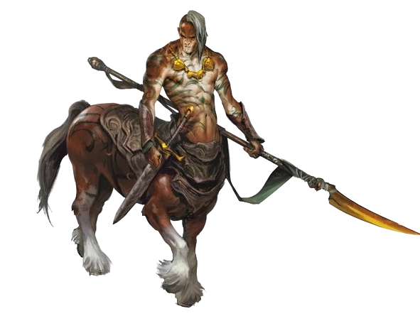 Centaurs stood between 7 and 8 feet tall and weighed between 700 and 1,200 pounds, with the upper half resembling a Mortalkind and the lower half of their body resembling a Horse. Native to the Vivid Realms, they could also be found on the Prime Material, where they were known for their speed and endurance. Their powerful legs also made them formidable in physical combat, especially in ranged fighting with bows.