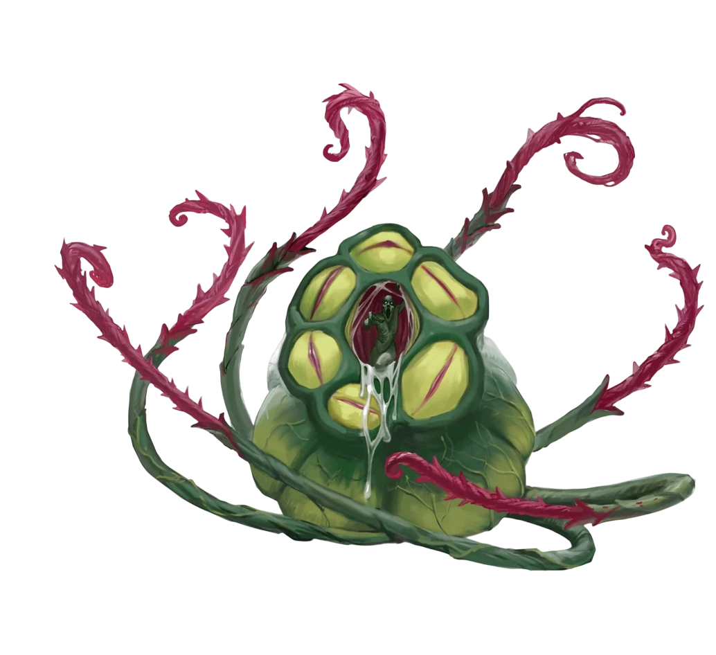 Bodytaker plants were intelligent and malicious Plant creatures that sought to dominate their surroundings by replacing other life with their own Podlings. They appeared as a massive central pod surrounded by countless vines, supported by root systems that spread deep and wide through the soil. Destroying one was notoriously difficult, since even a single surviving root fiber could regenerate into a new plant unless the soil was poisoned or salted. Capable of Telepathy and Deep Speech, bodytaker plants combined cunning with physical strength, using their vines to crush or capture victims and drag them into their central pod.