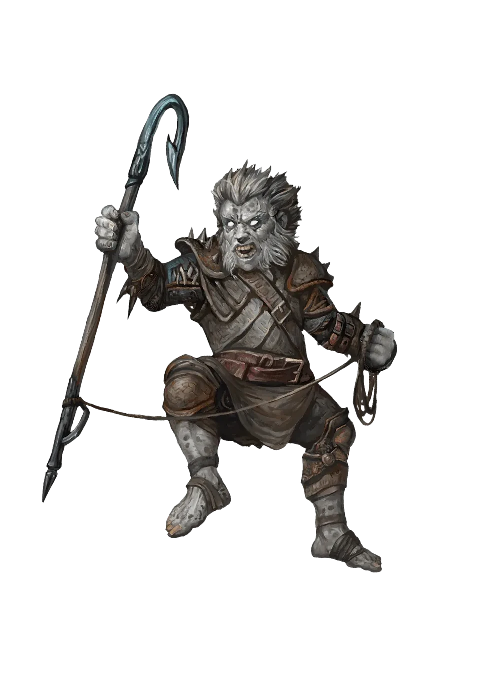 Derro were small, twisted Mortalkind of the Underdark who resembled stunted and thin Dwarves. Living to be only one hundred and fifty years old, their skin was a blue-gray hue, their hair often pale or white, and their eyes were uniformly blank, lacking pupils or irises. Though most closely resembling Dark Dwarves, they were uncommonly wiry and agile, able to see in complete darkness and even into ultraviolet light, though sunlight made them sick. Derro appeared haggard and pitiable at first glance, often dressed in ragged clothing, but beneath this appearance they were cunning and dangerous. They favored weapons that could strike from surprise, such as crossbows laced with poison or hooked blades suited to cruel attacks.