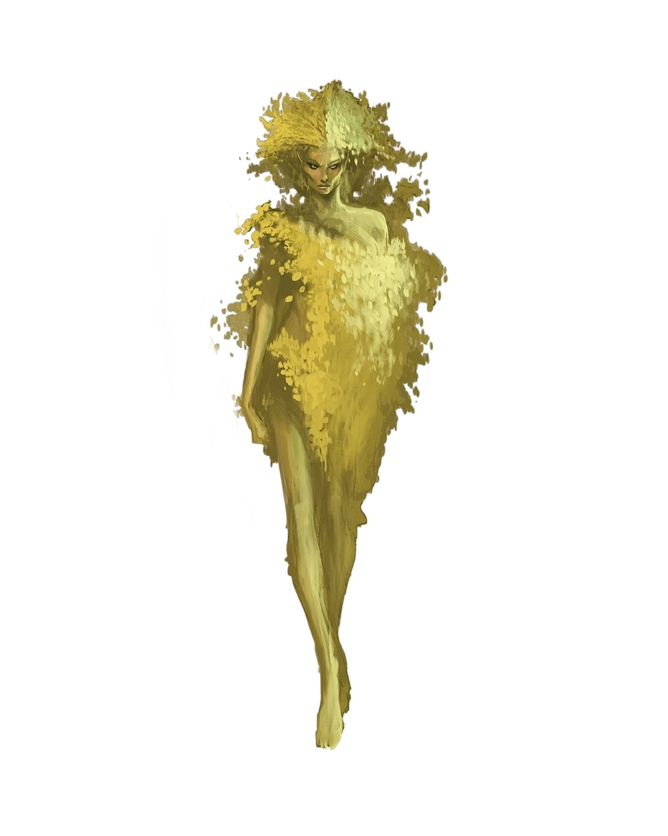 Dryads were Plant-like Fey spirits bound to the life of a single tree, most often oaks, with which their existence was intrinsically linked. They appeared as graceful, Mortalkind women with features that often reflected the type of tree they were tied to, such as bark-like skin, leaf-like hair, or eyes the color of deep wood. A dryad’s strength and vitality were connected to their tree, and any harm done to it directly weakened or even killed them. Though shy and reclusive by nature, they were known to defend their trees fiercely, using Enchantments, charm, or guile to drive away intruders who threatened their grove.
