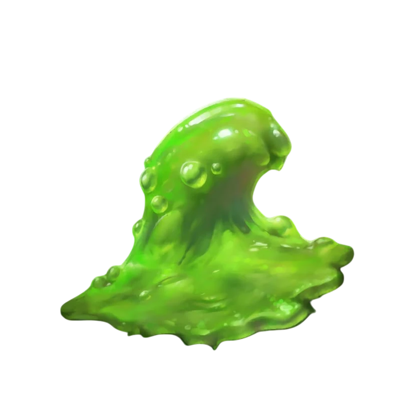 Green slimes were acidic Oozes that clung to walls, ceilings, and other surfaces, waiting for unsuspecting prey to pass below. Bright green, damp, and sticky, they were sometimes mistaken for moss or other plant growths. Once disturbed, they would drop onto victims, dissolving flesh, armor, and weapons alike with their corrosive touch. They spread slowly, often covering an area of about five feet across, and could persist for years in forgotten tunnels or dungeons. Though vulnerable to fire, frost, sunlight, and Spells that cured disease, green slimes possessed spores that could remain dormant and eventually restore a colony even after it had been nearly destroyed.