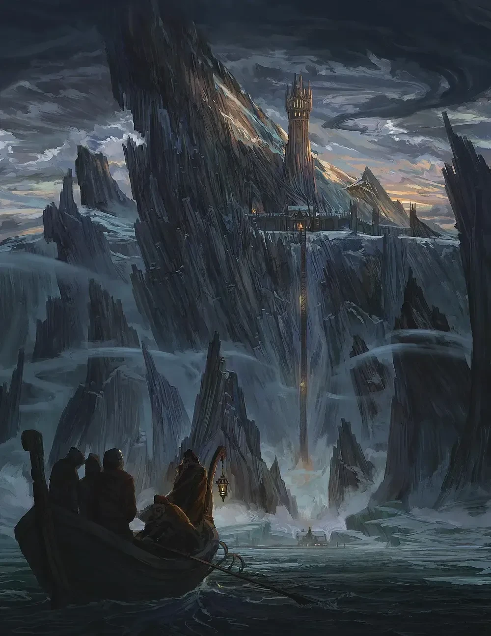 Carved into the seaward cliff of Breakbleak Rock to protect its residents from the harsh winds of the southern Shifting Blue, the prison formed a low, star-shaped complex dominated by a central tower. Four guard towers rose from the outer points of the structure, while sections of the prison backed directly into the island’s rock, creating interior chambers that felt more excavated than built. The main tower rose some 140 feet above the prison, which itself was 160 feet above a dock to the Shifting Blue. The dock was accessible by a crane elevator, operated via switch to allow oncoming boats which brought in supplies and staff.
