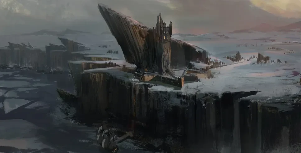 Its central tower rose starkly above the surrounding structures, visible for miles, while lower wings spread outward in a rigid star before vanishing into the stone itself. The exposed courtyard lay open to wind and snow, offering little shelter not provided by the Breakbleak itself. Snow and ice gathered in the lee of walls and towers for much of the year, while the surrounding waters churned violently against the base of the cliffs, making approach dangerous even in calm weather.