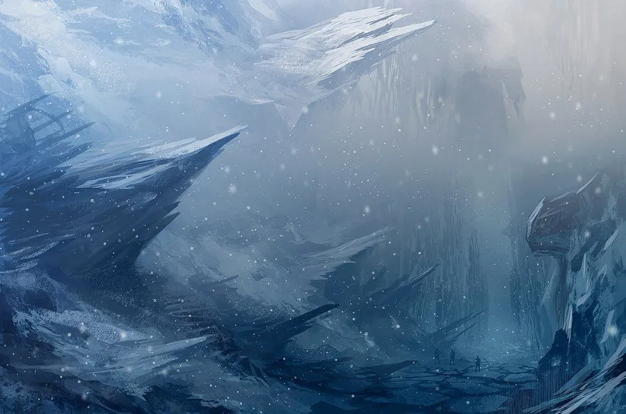 The Realm of Ice, also called the Plane of Ice, lay at the intersection of the Realm of Air and the Realm of Water within the Cosmic Wheel. It was a vast, frozen expanse where cold winds and solid water shaped the plane in equal measure. Endless glaciers, frozen seas, and towering ice formations dominated the landscape, slowly shifting and grinding against one another. Gravity was generally stable, but footing was treacherous due to slick surfaces and frequent fractures in the ice. Light was dim and diffuse, reflected endlessly through snow, frost, and translucent ice, creating long stretches of pale twilight.
