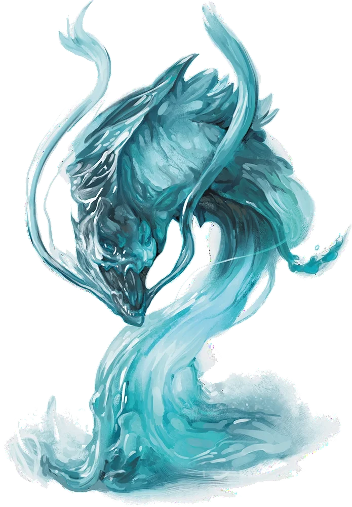 Water weirds were Elemental guardians bound to a specific body of water, most often a pool, cistern, fountain, or magically sustained basin. While fully immersed, they were indistinguishable from the water that housed them. Only when their domain was disturbed did they reveal themselves, rising in a coiling spout with a serpentine outline, sometimes suggesting the head of a snake or dragon formed from spray and current.
