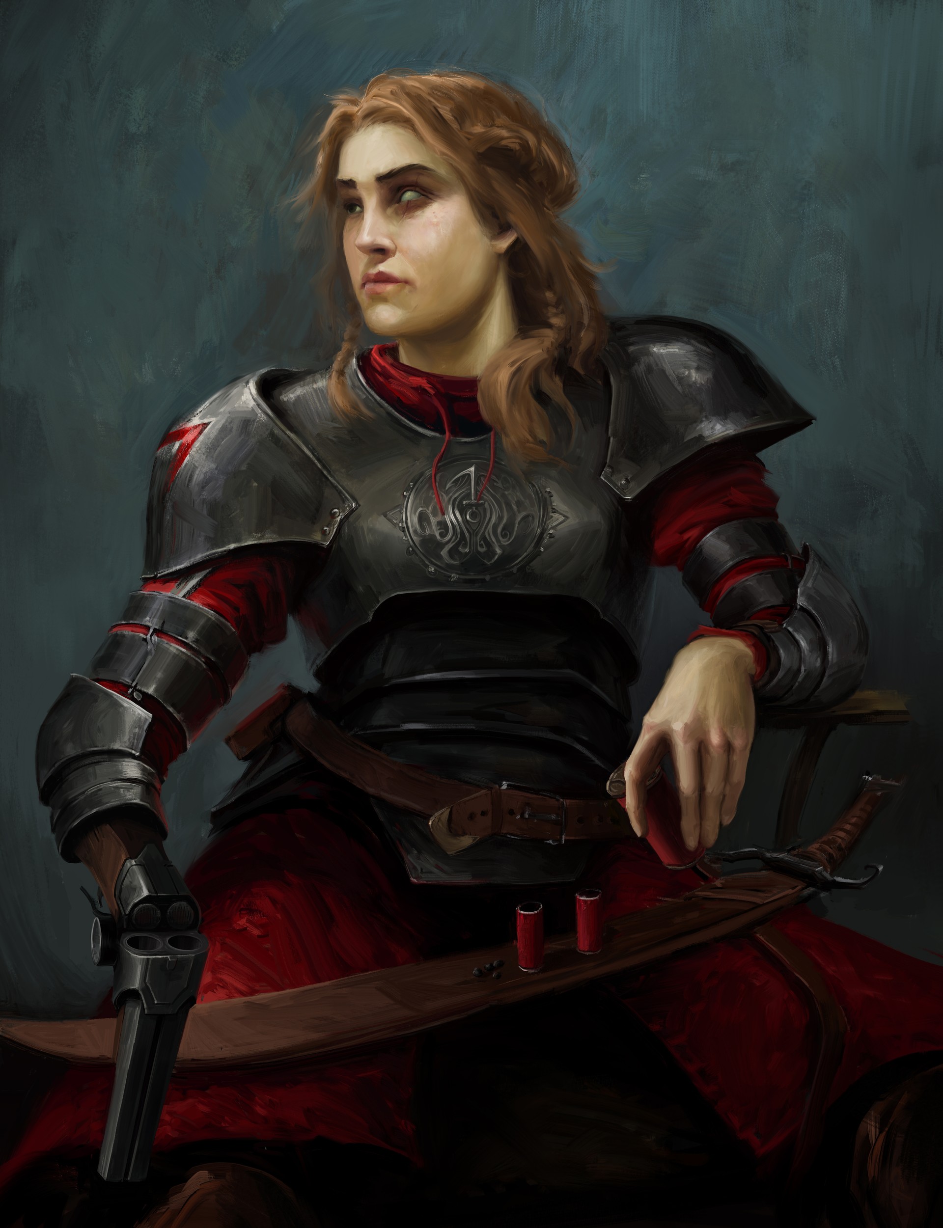 Wardina is a female human, leader of the guards of Port Giza. She lost her left eye to a bee sting in 1023 AC. Note regarding the picture: She doesn't have a gun for a right hand. Word count: 35
