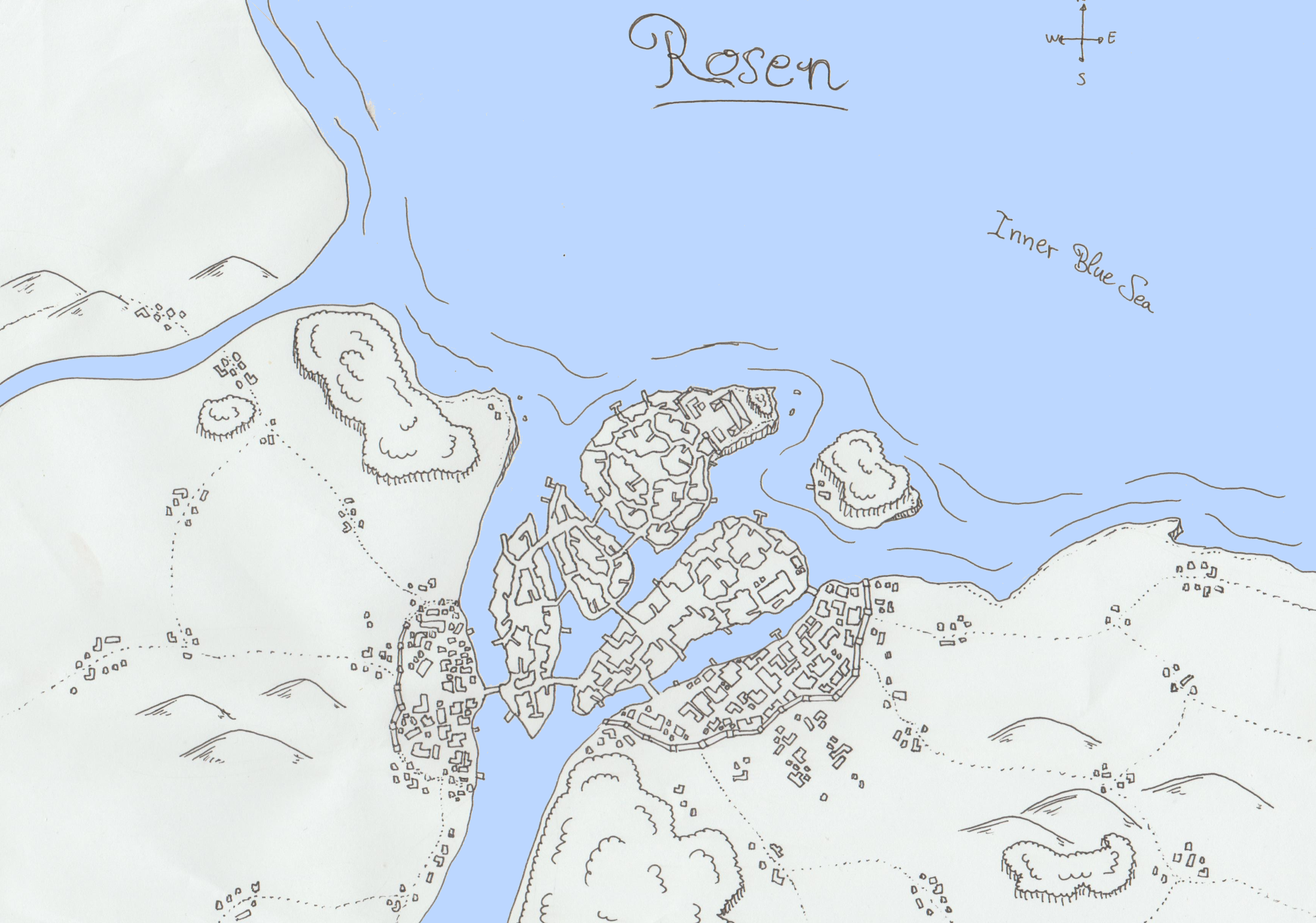 The city of Rosen is the third biggest city of the Kingdom of Arden, build on several islands where the Elm River flows into the Inner Blue Sea. The coast and the islands closest to the sea all have steep cliffs. The islands themselves are only a few meters high in elevation, and quickly raise in height towards the northern tips. Legends says that the islands were also high in elevation once, but continued growth took a toll on the earth beneath the town.