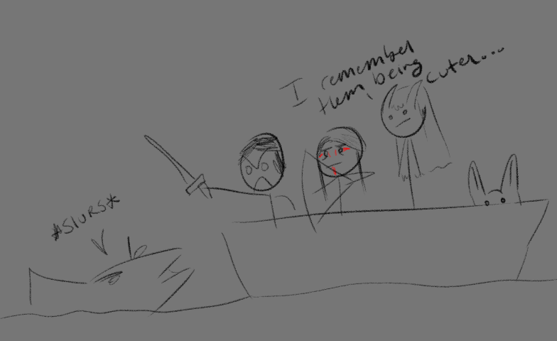 We jump into the boat along a lava stream, as we went there was a bump under the craft. We heard a weird noise like a goblin being strangled under water, and a giant fish-like creature leapt out of the water. They challenged us to a fight, to which we were all but forced to comply with. We killed one, and beat the hell (pun intended) out of the other two and they claimed it was a good fight then swam off. Truly, I do not understand the purpose of that. But I took a walloping, getting lava splashed on me and steam shot into my face. I nursed my wounds awkwardly as we continued up this river of fire.