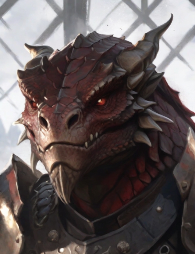 Fyren Ashenscale, a formidable red dragonborn, stands tall as a pillar of strength and mastery in the realm of blacksmithing. Residing in the town of Oakheart within the land of Rivermond, Fyren co-owns the renowned "Firegiant" smithy and shop alongside his business partner, Ivar Hammerson, a talented human blacksmith with whom he shares a fierce but friendly rivalry.