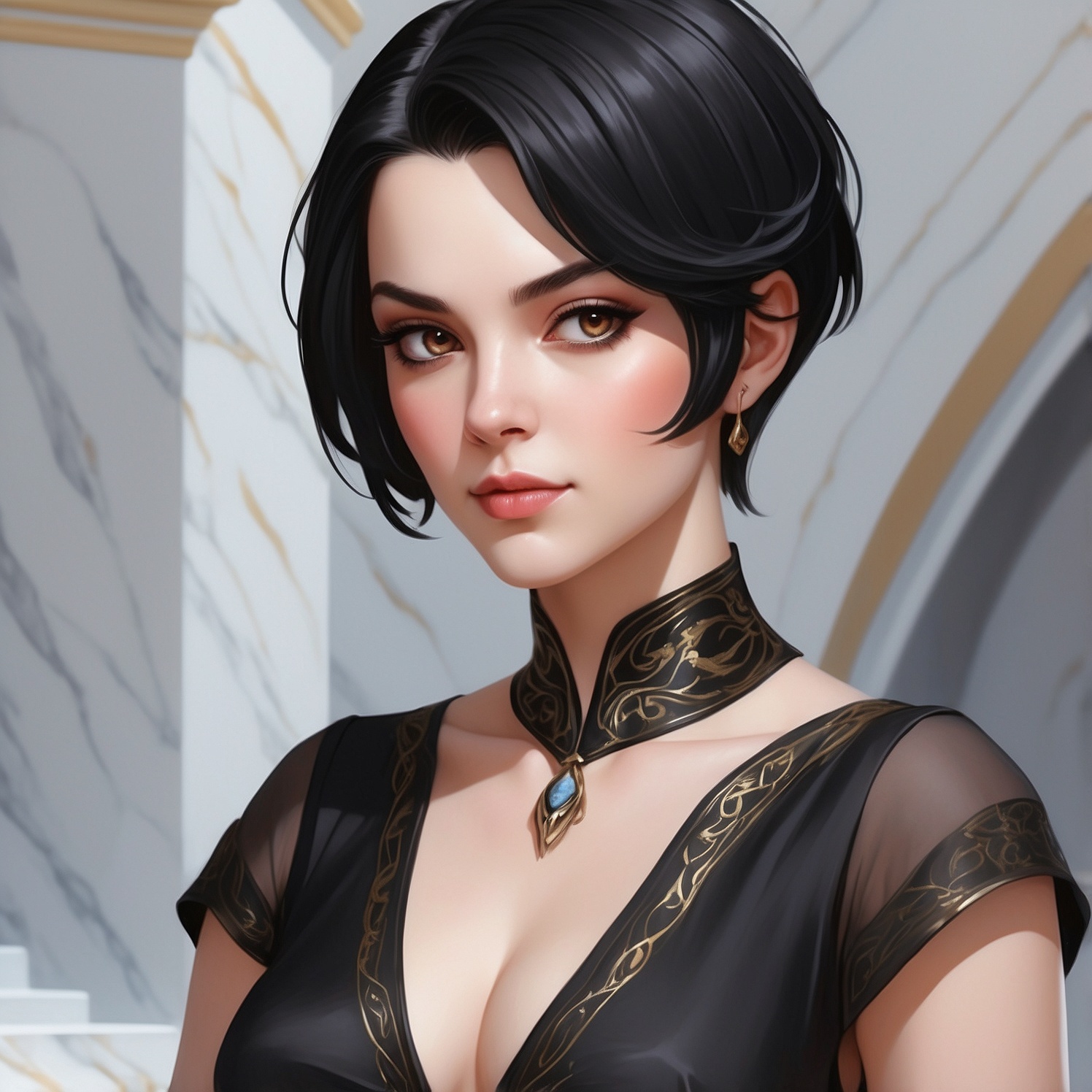 With her porcelain skin, cascading locks of short black hair, and piercing emerald eyes, Lady Genevieve is a vision of timeless beauty. Her delicate features are complemented by a regal posture and a radiant smile, making her a captivating presence in any room she enters.