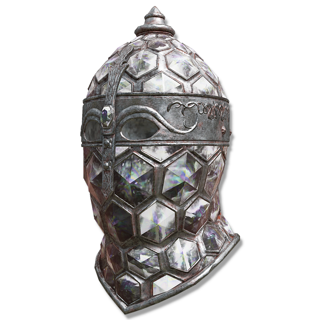 A formidable full-face helm, crafted from gleaming steel and intricately decorated with swirling, self-reflective chdinmail and elaborate mirrors. It radiates an aura of grandiosity and commands attention with its self-absorbing embellishments.