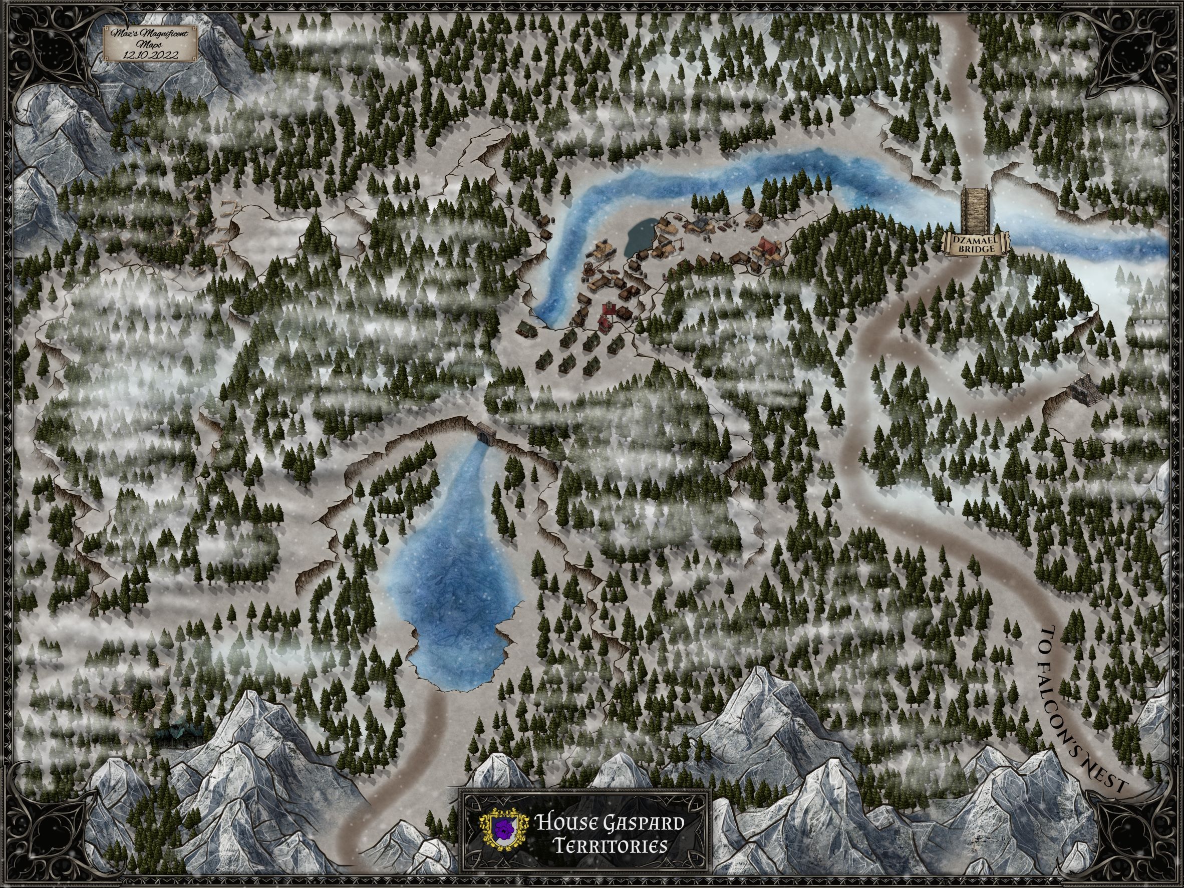 Gaspard is broken into three places: the hightown, the lowtown, and the castle. The hightown rests up above the cliffs that look down over the river that the lowtown straddles. Up above the buildings below sit Gaspard's famously rumored greenhouses and the airship dock that can house up to one large airship, or two smaller ones. During the worst of the snow, the greenhouses can become engulfed, looking like they're encased in ice until they're broken free.