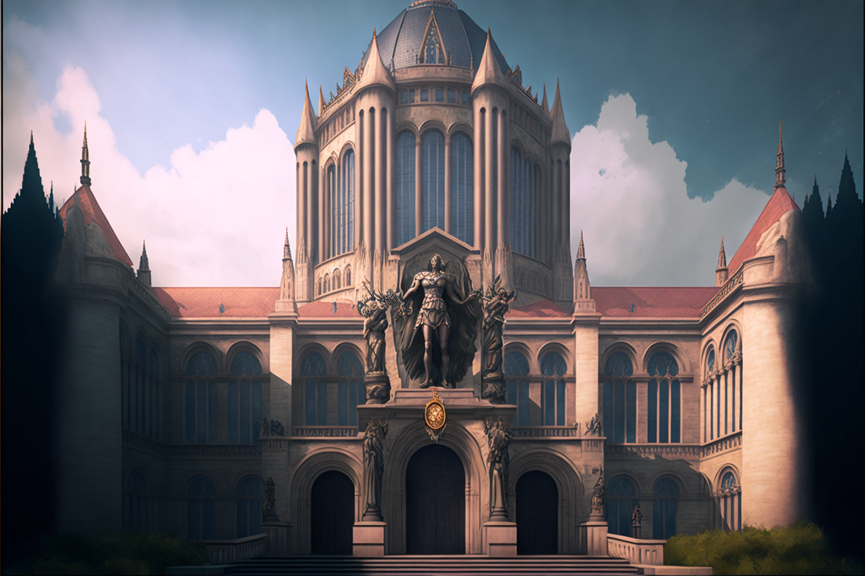 The building is symmetrical, with the main entrance centered in the front up a series of stone steps. The door leads into a tall, wide hallway. The hallway is flanked by two statues. On the left, Kolrehs stands holding out a sword. On the right, Kolrehs stands with a scale or balance in his hand. Likewise, the building itself is divided. To the right, there are courtrooms and trial chambers. To the left, investigators and interview rooms. Somewhere below are the prison cells.