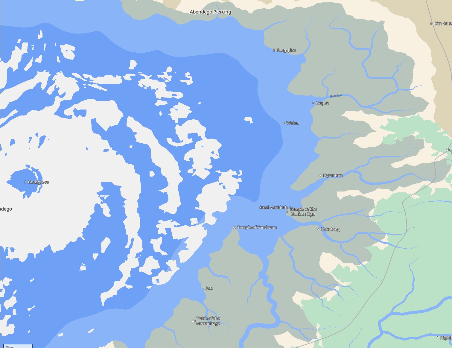 - The Gullet is what remains of the ancient city Kokutang. On the cliffs overlooking a massive swirling sinkhole, various small hamlets reside. Several sea-cave systems that spread from a massive sinkhole where the entrance to the city used to be, these subterranean systems form a rich ecosystem with plants and sealife that those brave divers can easily feed their villages with. Many would-be adventurers attempt to brave deeper into the cave systems than the divers dare go, rumors of treasure untouched flitting their way to the various pirate and merchant bands of the Sodden Lands, few ever come back, and most that do are empty-handed.