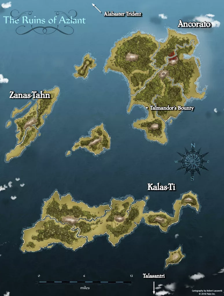 Azlant is the continent West of the original location of the World Weep, and is between the nations of Avistan and Arcadia. Due to it being mainly underwater, it doesn't have many settlements nor nations and is not split into regions. Places of interest include Acrolan, Aroden's Rock, Bilith-Vel, The City of Golden Gates, House of Aeons, Talmandor's Bounty, and the Towers of Heaven.