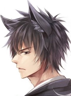 Hybrid Form: dark green eyes, human face and body, black hair, fluffy ears and tail.